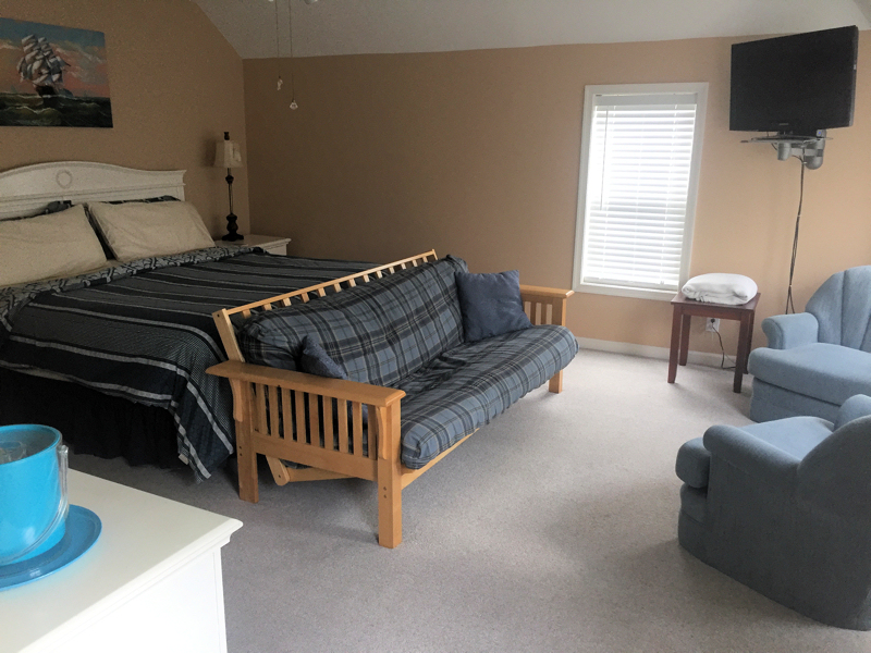 Room #1 is a spacious master suite complete with private bath. Master suite has the same relaxing atmosphere that you will find throughout Wanchese Inn. Soak in the Jacuzzi after a long day of exploring the Outer Banks. Features include king size bed, comfortable chairs, television, and futon.